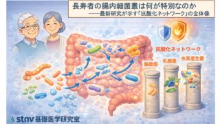 最新研究で明らかになった、長寿者の腸内細菌叢の特徴とは。酪酸産生菌・乳酸菌・水素産生菌が連携して形成する“抗酸化ネットワーク”の全体像を、日本人の特性とともに紹介します。
