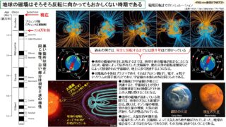 熱-光-電場-磁場 地球の磁場はそろそろ反転に向かってもおかしくない時期である 地球の磁場が完全に反転するまでは、地球全体の磁場が弱まることになるため、磁場によって防がれていた太陽風や、他の天体の超新星爆発などによって放射された宇宙線が、地上に多く到達するようになる。地球の磁場が弱まっている段階では、地球の大気にも影響が出る。例えば、オゾン層の破壊、雲の発生量の増加、大気の剥ぎ取り、などが懸念されている。 2025.10.15 2025.10.16 熱-光-電場-磁場