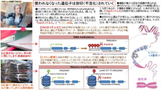 人体のメカニズム 使われなくなった遺伝子は封印(不活化)されていく 使われない遺伝子は、幾つかの方法によって、容易に使えない形に変化させられる(封印される)。そのうち、主な方法は〝DNAのメチル化〟と〝ヒストン修飾〟の2つである。封印される遺伝子が増えることは機能低下に繋がりかねないため、必要以上に封印させない工夫が必要である。その方法は、様々な遺伝子を使い続けることである。 2025.10.28 2025.10.29 人体のメカニズム