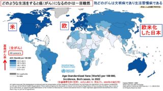 がん-癌 どのような生活をすると癌(がん)になるのかは一目瞭然 図において、色の濃い国ほど、発がん率が高いことを示している。特に目立つのは、北米、ヨーロッパ、日本、オーストラリアやニュージーランドである。何はともあれ、私たちは欧米の真似をするのではなく、欧米にあこがれるのでもなく、発がんが少ない国の生き方を真似る必要がある。それは、明治よりも前の日本の姿に戻ることでもある。 2025.10.30 2025.10.31 がん-癌