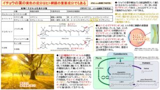 天然物質-植物成分 イチョウの葉の黄色の成分はヒト網膜の重要成分でもある イチョウの葉が黄色くなる原因物質として最も多く含まれているのはルテイン、次に多いのはゼアキサンチンであり、これらはキサントフィルと総称されるカロテノイドである。ルテインとゼアキサンチンは、ヒトの特に網膜の黄斑部にも多く存在している。なお、ヒトの場合は、ルテインの何割かがメソゼアキサンチンへと変換され、黄斑部の中心付近に多く分布する。 2025.11.08 天然物質-植物成分