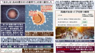 生命-進化 「自分」は1兆400億分の1の確率でこの世に誕生した 受精という現象にて「自分」が生じた確率は1億分の1(=0.000001%)。受胎に要する期間を考慮に入れると「自分」が生じた確率は312億分の1まで下がる。両親が出会って子を持つ確率を掛け合わせると、最終的に、「自分」が生まれた確率は1兆400億分の1となり、奇跡の積み重ねで「自分」が生じたことが判る。 2025.12.01 生命-進化