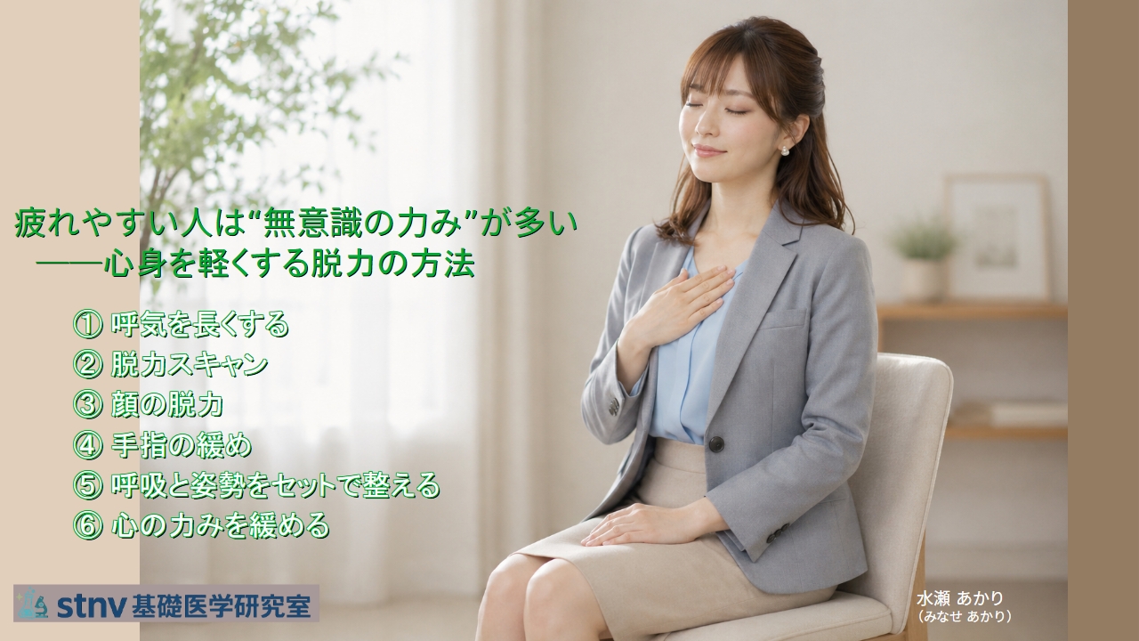 また、“疲れやすさ”というのは体質ではなく、心身の使い方の癖によって大きく変わるということです。今日から、“力を抜く”ことの重要性にも意識を傾けてみてください。